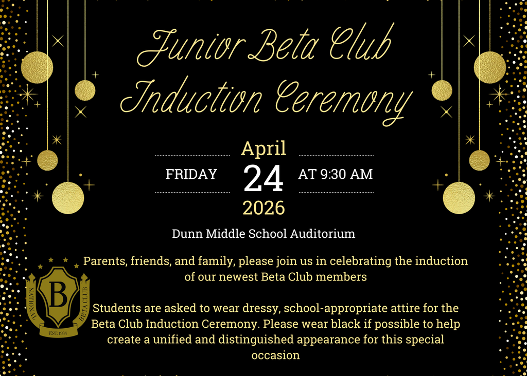 Dunn Middle School will host its Junior Beta Club Induction Ceremony on Friday, April 24, 2026 at 9:30 AM in the school auditorium. Families and friends are invited to join us as we celebrate our newest Beta Club members and their academic achievement and leadership.